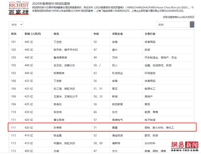 2020胡潤百富榜揭曉 嘉晨集團董事長孫壽寬再度入選
