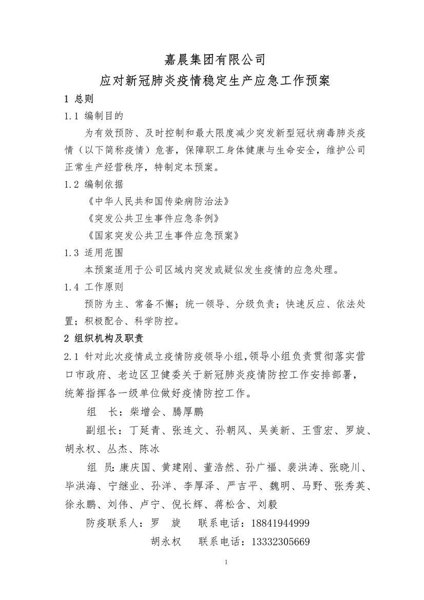 嘉晨集團應對新冠肺炎疫情穩定生產應急工作預案